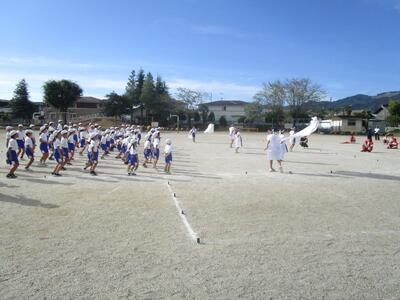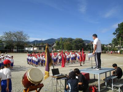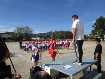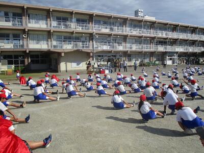 今朝は体育朝会で運動会の練習をしました。運動会当日まであと3日となり、さらに練習に熱が入っています。開会式から閉会式、応援練習までを通して行いました。当日も今日のような青空の下で運動会が実施できるとうれしいです。