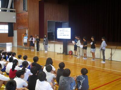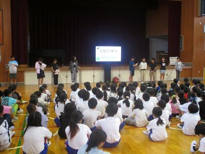 今朝の児童朝会では、図書委員会による発表がありました。図書室の利用方法や本に関するクイズ、読書月間についての紹介でした。10/1(水)~10/31(金)の1か月間は読書チャレンジ月間です。クラスで読書の目標を立てて取り組んだり、読書量の多い児童を表彰したり、親子で読書を楽しむ「親子読書」も実施しています。暑さも和らぎ、過ごしやすい季節となりました。この機会にぜひたくさんの本と出会い、読書の楽しさを味わってください。